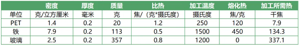 在简化计算中,密度、厚度、质量、加工温度为实测与合理估计值。比热、熔化热来自百度百科。计算公式:加工所需热=质量*([加工温度-20)*比热+熔化热]。以上计算,是概念性的比较,但可以看出,在这三种材料中,塑料的加工能耗是最低的。金属的加工能耗是塑料的约17倍,玻璃的加工能耗是塑料的约40多倍。